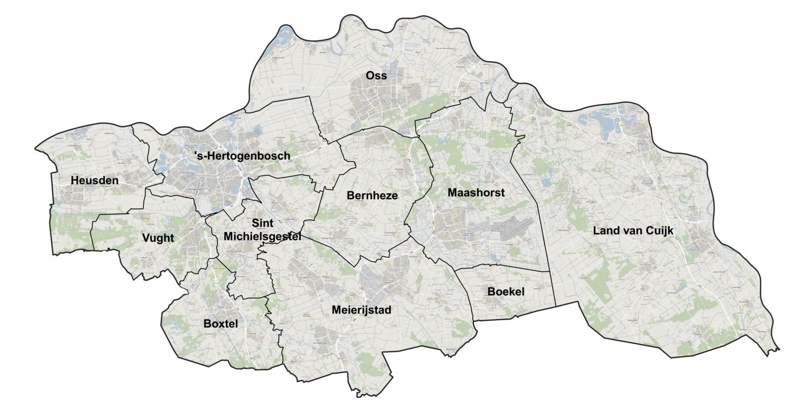 Bernheze, Boekel, Boxtel, Heusden, ‘s-Hertogenbosch, Land van Cuijk, Maashorst, Meierijstad, Oss, Sint-Michielsgestel en Vught.